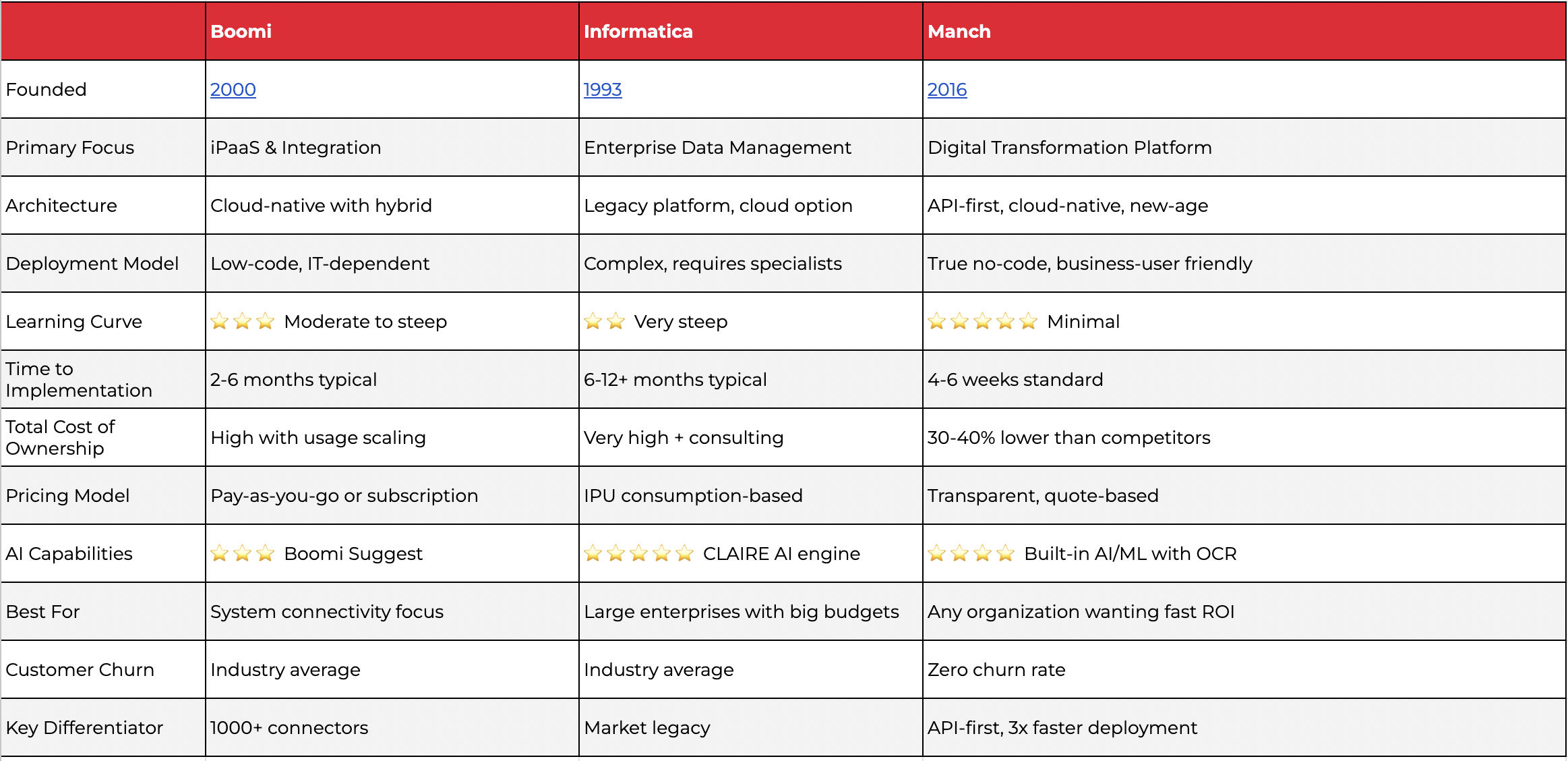 The enterprise platform landscape has evolved beyond legacy approaches. While Boomi and Informatica debate incremental improvements to decades-old architectures, Manch demonstrates that modern, cloud-native platforms can do everything they do—faster, better, and more cost-effectively.