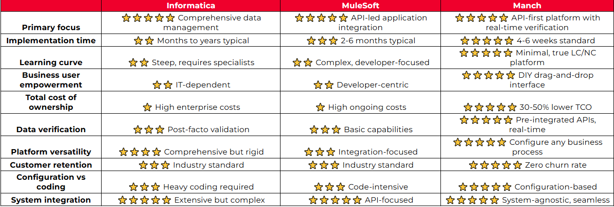 While Informatica and MuleSoft compete in traditional integration, Manch has built an API-first platform specifically designed for modern data management challenges.