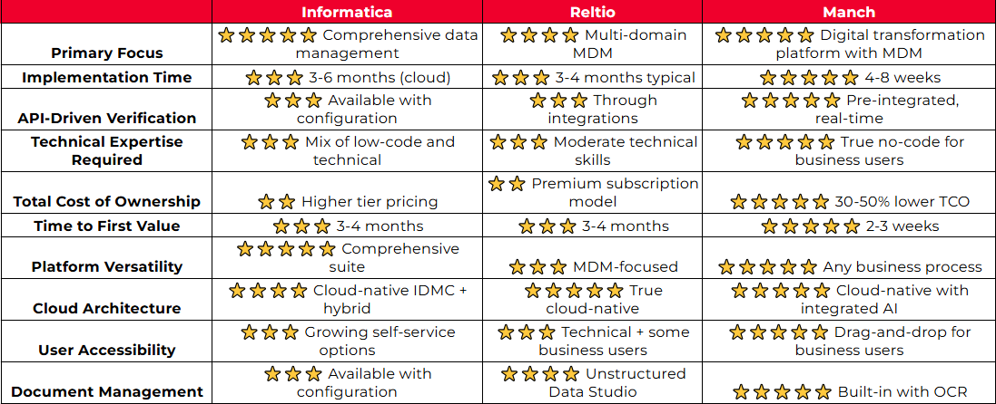 The MDM and data management landscape has room for all three platforms, as they address different organizational needs and priorities. Informatica provides the most comprehensive enterprise data management suite, though its legacy architecture and complexity can slow innovation. Reltio delivers sophisticated cloud-native multi-domain MDM with strong real-time capabilities. Manch offers a modern, API-first digital transformation platform that combines master data management with workflow automation and real-time verification, delivering enterprise results in weeks rather than months at significantly lower total cost of ownership.