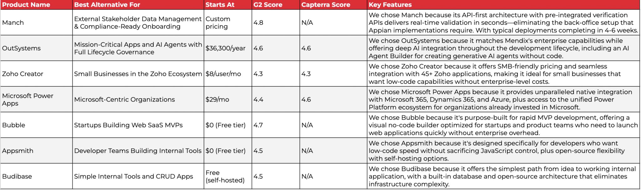 ❗DISCLAIMER: We aren’t covering every low-code platform on the market! Our focus is on highlighting the best alternatives that address specific use cases where a more specialized or differently-focused solution might serve you better than Mendix’s comprehensive approach.