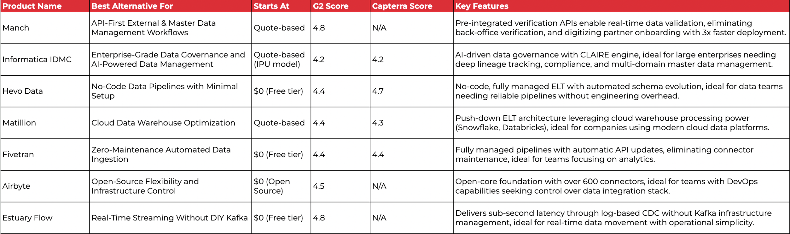 These alternatives don’t have to replace Talend entirely. Many organizations may find value in using Talend alongside specialized tools, using Manch to capture validated external data that then flows through Talend pipelines, or complementing Talend’s capabilities with Estuary Flow’s real-time streaming.